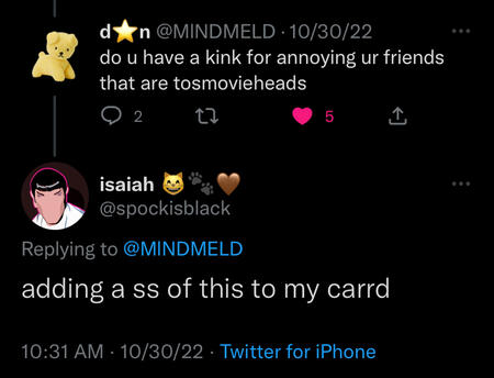 i'm serious when i say spock is Black. he's a nigga. he relaxes his hair because sarek is an asshole and he's lightskin because his mom is white. that is a bonafide african american man right there.